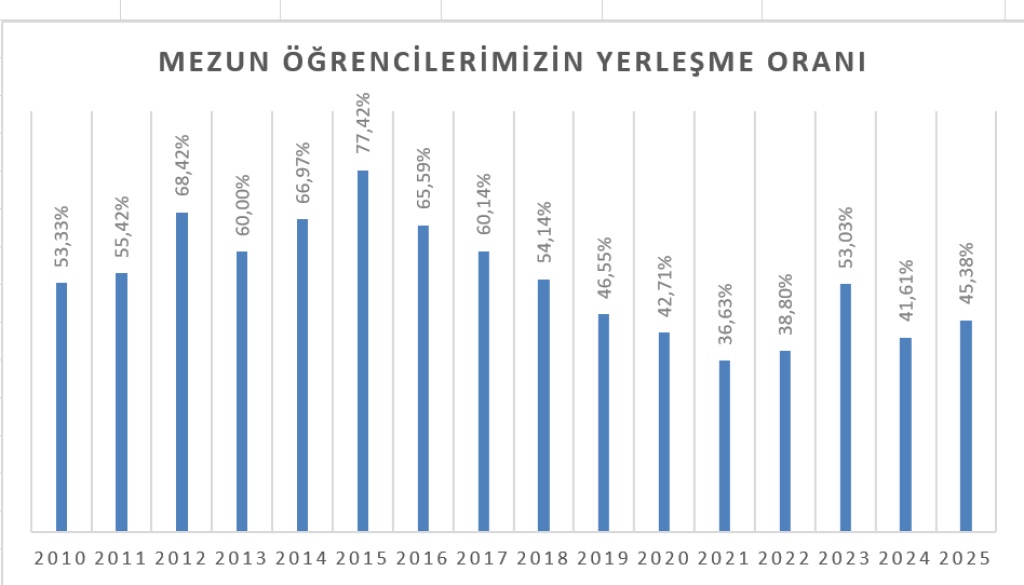 119 öğrencimizin mezun olduğu 2025 yılında 54 öğrencimiz yüksek öğretim programlarına yerleşerek %45,38'lik yerleşme oranına ulaştı.